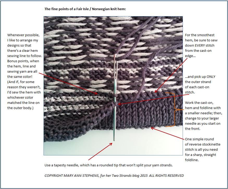 Hi Becky! I think we all are happy to minimize finishing work…as long as any shortcut we take leaves us with an equally happy result. I’m not a huge fan of hemming on the fly, as you’ve described (and as I wrote about way back in ’07 https://twostrands.com/2007/12/16/hemmed-knitting/) for two reasons: