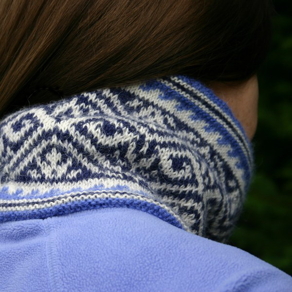 Riverside Cowl PDF, knit in three shades of sport weight alpaca.